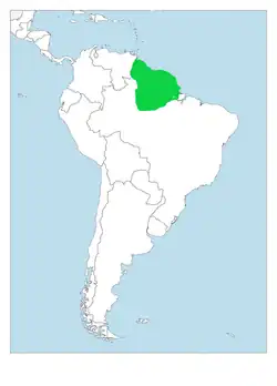 Se encuentra en las selvas húmedas del norte de Brasil, la Guayana francesa, Guyana, Surinam y Venezuela.[1]