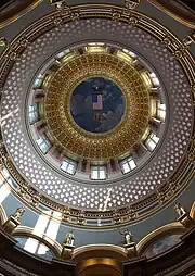 La característica dominante es la cúpula central construida de hierro y ladrillo y cubierta con finas láminas de papel de seda de oro. Hay una capa protectora que sella el oro de la intemperie. El pan de oro fue reemplazado en 1964-1965 a un costo de cerca de 80.000 dólares. La reconstrucción más reciente de la cúpula se llevó a cabo entre 1998 y 1999, a un costo de aproximadamente 482.000 dólares.[4] La cúpula está coronada por una linterna de vigía a la que se puede llegar por largas y sinuosas escaleras, y termina en un remate de 83,8 m encima de la planta baja.[5] Desde su inauguración durante 1884 hasta 1924, fue el edificio más alto de Des Moines, y probablemente de todo el estado.[6] La rotonda debajo de la cúpula mide 24,4 m de diámetro. Cuatro cúpulas más pequeñas de diseño simple se elevan desde las cuatro esquinas del Capitolio.