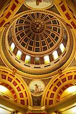 La característica más notable dentro del centro del edificio del Capitolio es la enorme rotonda, con cuatro pinturas circulares que la rodean. Estas pinturas, pintadas para la inauguración del Capitolio en 1902 por la firma de F.Pedretti's Sons, representan cuatro arquetipos importantes de personas de la historia temprana de Montana: un nativo americano (destinado a ser el jefe Charlo), un explorador y cazador de pieles (Jim Bridger), un minero de oro (Henry Finnis Edgar, uno de los descubridores del oro en Alder Gulch) y un vaquero (no identificado, pero se dice que está inspirado en las obras de CM Russell).[6] Los hermanos Pendretti proporcionaron obras de arte adicionales encargadas en las Cámaras del Senado y del Antiguo Tribunal Supremo.[7]