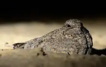 Miden unos 23 cm de largo, y pesan unos 57 gr. Es una especie con cierto grado de dimórfismo sexual. Sus partes superiores son de color gris arena, ligeramente manchado de color marrón negruzco y marrón claro, con nuca ante. Su plumaje se asemeja a la corteza de un árbol, hojas secas o suelo arenoso. Tiene patas pequeñas fáciles de usar y que se posan. El pico corto es de color gris claro y tiene cerdas alrededor de la boca. Su iris es de color marrón negruzco oscuro. Las alas son largas y angostas. Su llamada es un sonido prolongado ululante.[3][4]