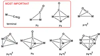El ligando carbonilo no solo puede actuar como ligando monodentado (que se une solo a un metal con un enlace simple), sino que puede actuar con una hapticidad mayor, en una gama de modos de enlace en dímeros y clusters. En el modo de puente más común, el ligando CO tiende un puente sobre un par de metales (CO-μ2). Este modo de unión se observa en los carbonilos metálicos comúnmente disponibles: Co2(CO)8, Fe2(CO)9, Fe3(CO)12, Co4(CO)12, etc.[18] En ciertos compuestos clusters de mayor número de átomos metálicos, se pueden tener puentes CO entre tres o incluso cuatro metales (estos ligandos se denotan μ3-CO y μ4-CO). Menos comunes son los modos de enlace en el que tanto átomo de carbono como el de oxígeno se enlazan al metal, por ejemplo, μ3-η2.