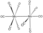 | Mn2(CO)10 Tc2(CO)10 Re2(CO)10 | amarillo blanco blanco | D4d | 2044 (m) 2013 (s) 1983 (m) 2065 (m) 2017 (s) 1984 (m) 2070 (m) 2014 (s) 1976 (m) | 18 | ![]() |