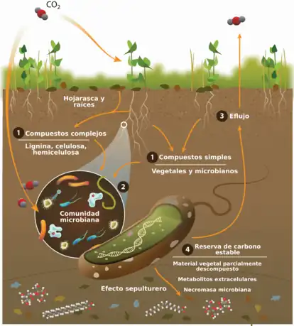 Aproximadamente 60 GtC/año se acumulan en el suelo. Este 60 GtC/año es el balance de 120 GtC/año contraído de la atmósfera por la fotosíntesis de las plantas terrestres reducidas en 60 GtC/año de respiración de la planta. Un equivalente de 60 GtC/año se respira del suelo, uniéndose a la respiración de la planta de 60G tC/año para regresar a la atmósfera.[6][7]