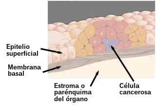 El carcinoma in situ es el carcinoma que no ha roto la capa basal y, por ello, no se ha extendido. El concepto tiene un interés especial ya que se considera que los cánceres in situ son susceptibles de ser curados con una simple extirpación tumoral.