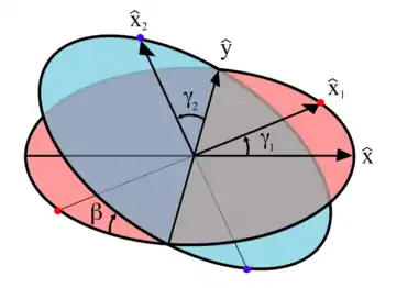 Estas variables se ilustran en el diagrama de la derecha. También se muestra un conjunto de coordenadas cartesianas fijo con vectores unitarios e , y los planos de rotación de cada eje. Estos planos de rotación son perpendiculares a los ejes de rotación y no se mueven cuando los ejes giran. Los dos ejes están unidos por un cardán que no se muestra. Sin embargo, el eje 1 se une al cardán en los puntos rojos en el plano de rotación rojo en el diagrama, y el eje 2 se une en los puntos azules en el plano azul. Los sistemas de coordenadas fijos con respecto a los ejes rotativos se definen teniendo sus vectores unitarios del eje x (y ) apuntando desde el origen hacia uno de los puntos de conexión. Como se muestra en el diagrama, está en el ángulo con respecto a su posición inicial en el eje x, y está en el ángulo con respecto a su posición inicial en el eje y.