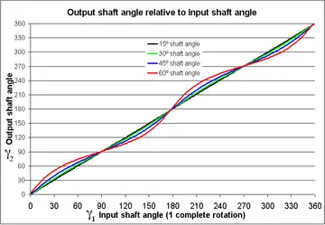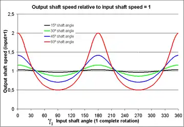Como se puede apreciar en la gráfica de la derecha, cuanto mayor es el ángulo que forman los dos ejes, mayores son las diferencias tanto de velocidad como de aceleración angular entre ambos.