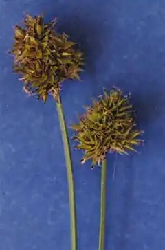 Esta juncia produce densos racimos de tallos erguidos con más de 20 centímetros de altura y hasta alrededor de un metro de altura. La inflorescencia es un denso grupo de espigas de color verde o marrón y envasados herméticamente el uno en el otro.