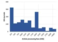 Diferentes editoriales académicas tienen niveles de tarifas muy variables, que van desde menos de US$ 100 hasta más de US$ 3000.[1][11][12] Los editores tradicionales a veces cobran tarifas altas para publicar en una revista híbrida de acceso abierto, lo que hace que un artículo individual en una revista de suscripción tenga acceso abierto. Se calcula que el APC promedio para las revistas híbridas es casi el doble que los APC de editores de acceso abierto completo.[13] Las revistas con factores de impacto alto de las principales editoriales tienden a tener los APC más altos.
