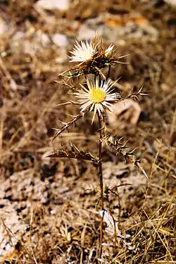 La Carlina sicula es una especie herbácea que, como todas las de la familia Asteraceae, se asemejan al cardo. Es una especie común en la cuenca del Mediterráneo.[1]