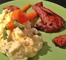 En Australia, la pierna de cordero asada se considera el plato nacional.[6] Se sirve habitualmente los domingos o en cualquier otra ocasión especial, y se puede hacer en una barbacoa de cuba o en un horno convencional. La preparación típica consiste en cubrir la pierna de cordero con mantequilla, introducir ramitas de romero en las incisiones hechas en la pierna y espolvorear hojas de romero por encima. A continuación, el cordero se asa durante dos horas a 180 °C (356 °F) y suele servirse con zanahorias y patatas (también asadas), verduras verdes y salsa.
