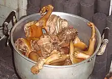 Carne de perro parcialmente cocinada en una cazuela, mostrando zarpas, patas y una lengua, entre otras partes. Fotografía tomada en el Sureste de Asia.