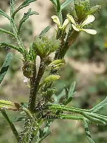 - Planta erecta de 5-40 cm de alto de tallos erectos longitudinalmente surcados con hojas bipinnatisectas de 2-6 por 1-3 cm, con los segmentos de segundo orden lineares —ocasionalmente lobulados—, obtusos, frecuentemente mucronados. Las flores, en racimos de 10-40 individuos tienen pedicelos de 1-1,5 mm en la antesis, y recurvados y de hasta 3 mm en la fructificación. Los sépalos miden 4-5 mm, y los pétalos 7-9 mm. Los frutos son patentes o reflejos con el artejo valvar de 3-4 por 2-2,5 mm, con las 2 valvas convexas, recorridas por tres nervios conspicuos, cubiertos de pelos cónicos y el rostro, convavo, de 4-6 por 3-4 mm, con la concavidad hacia arriba. Las semillas, de 1-1,5 mm, son de un color pardo oscuro, eventualmente algo rojizas.[1][2][4]