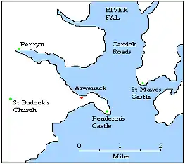 - en la ribera oriental, un pequeño entrante en St Mawes;