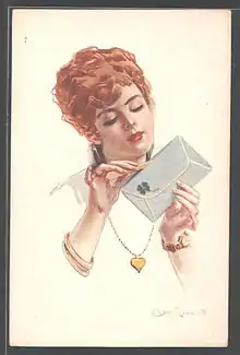 La carta de amor continuó floreciendo en la primera mitad del siglo XX - F Scott Fitzgerald nos da una Flapper absorbida en la composición de una de esas cartas sin compromiso, maravillosamente esquivos que sólo una niña puede escribir'[9] - e incluso puede haber sido alentada por el entonces prevalencia de la guerra mundial. Antes de la amplia utilización de las telecomunicaciones, las cartas eran una de las pocas maneras para que una pareja permaneciera en contacto, sobre todo en tiempos de guerra: cuando uno de ellos se envió o estacionado a cierta distancia de la otra, el "ser" aparte emociones a menudo intensificadas. A veces una comunicación normal deseada podría dar lugar a una carta expresando el amor, la nostalgia y deseos: "el acto mismo de la escritura suele provocar sentimientos de amor en el escritor '.[10] Durante estos tiempos, "cartas de amor" eran el único medio de comunicación, y los soldados de las direcciones deseables jovencitas incluso intercambian de manera que se podrían iniciar una comunicación inicial y posible inicio de una relación. En el lado negativo, cuando la correspondencia se retrasó, "nuestro movimiento, el secreto, la batalla ... podría ser explicado, pero ninguna explicación tranquilizó mi preocupación '; sin embargo, cuando llegaron las cartas, las contingencias operacionales podrían significar la necesidad de "Doblar la carta cuidadosamente lejos ... Dobla todo ese mundo de distancia, y la pasión y el amor, de manera que no podían ser heridos; pero por supuesto que estaban allí ... cuando vi a un hombre, cualquier hombre, leyendo una carta '.[11]