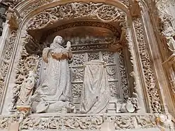 En el retablo también se ubican las efigies orantes de Juan II de Castilla, vestido con un manto dorado con la divisa del Ristre, y de su esposa la reina Isabel de Portugal.[6][7][8][9]