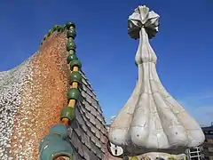Culmina la fachada una bóveda formada por arcos catenarios cubiertos con dos capas de ladrillo, recubierta con cerámica vidriada en forma de escamas —realizada en los Talleres Sebastià Ribó—, en tonos rojo, verde y azul, que recuerda el lomo de un dragón. En la parte izquierda hay una torre cilíndrica de forma bulbosa —semejante a una cabeza de ajo—, decorada con los anagramas de Jesús (IHS), María (M con la corona ducal) y José (JHP), y rematada con la típica cruz gaudiniana de cuatro brazos, orientada a los puntos cardinales.[27] Una de las interpretaciones simbólicas que se ha dado a esta fachada es la de San Jorge luchando con el dragón, cuyas víctimas se hallan en la fachada representadas por las columnas en forma de hueso y los balcones en forma de calavera. Así, la cruz de cuatro brazos sería la espada clavada en el espinazo del animal, del que brotaría la sangre, presente en la cerámica roja de esta parte de la cubierta.[28]