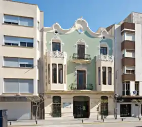 El cuerpo central se ordena en la planta baja con un gran portalón de madera, mientras que en las plantas superiores se desarrollan dos balcones con reja de hierro forjado con decoración vegetal muy estilizada. El remate de la fachada es mixtilíneo con tres óculos. La decoración es a base de motivos vegetales estilizados, característicos del modernismo valenciano.
