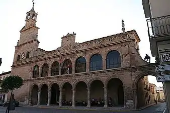 En 1565 se acordó que se labraran en el Ayuntamiento tres escudos, pero, al parecer, no llegaron a realizarse en su totalidad: uno con las armas del rey en el centro del edificio; otro con las armas del gobernador, en la izquierda; y otro con las armas de la villa, en la derecha. En 1577 se acordó la construcción de la torre, destinada a colocar en ella el reloj de la villa, situado hasta entonces en la torre de la iglesia parroquial de Santiago Apóstol. La obra finalizó en 1622, con el remate del chapitel que cubre la campana del reloj. Encima de la tercera columna de los arcos bajos hay una inscripción, en la que se puede leer con cierta dificultad: “ Esta obra se comenzó dos días del mes de agosto de 1585 (‘) años, reinando don Felipe II, Rey de España, y siendo su Corregidor de este marquesado el Ilte. Sr Don Francisco Zapata de Os…”. No se sabe a qué obra se refiere, dado que el edificio comenzó a construirse 50 años antes.