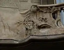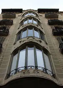 La fachada es de una austeridad contenida sin grandes ornamentaciones, pero de gran calidad y sutileza, sus formas ondulantes están resaltadas por la tribuna central que recorre todos los pisos, realizada en piedra, los adornos tallados se muestran sobre todo en la tribuna y en los balcones del primer piso, teniendo un trabajo en hierro forjado en las barandillas del resto de los balcones pertenecientes a las otras plantas del edificio. Toda la fachada es simétrica, excepto la puerta de entrada colocada hacia la parte derecha.