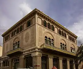 El edificio hace esquina y tiene una fachada que da a la calle de San Juan y otra al Mercado Central. En la construcción se enfatiza la volumetría cúbica y se anula la decoración escultórica dando importancia a los paramentos lisos y a las superficies planas.