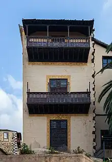 El balcón de la segunda planta es techado. De talla profusa, tanto en la base como en la parte inferior del antepecho y el alero, cuenta con tres columnillas corintias con sus zapatas igualmente talladas. En el antepecho, unos balaustres pareados y torneados sostienen la baranda.[1]
