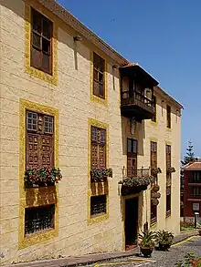 La puerta, "mezcla de los tipos tachonados y de cuarterones" -Martín Rodríguez, F. Gabriel: Arquitectura doméstica canaria, Ed. A.C.T., Santa Cruz de Tenerife, 1977- es el elemento más destacable de la planta baja. A la derecha, dos ventanos de pequeño tamaño -imperativos del emplazamiento, en acusada pendiente- mantienen la simetría. Las dos ventanas de la izquierda, al igual que las de la primera planta, son de cojinetes, provistas de antepecho, de dos batientes y con postigos de apertura hacia el exterior (de abajo hacia arriba).[1]