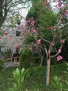 El acceso discurre paralelo a un jardín japonés, rodeado por varias especies de acer palmatum. En la parte posterior de la casa se encuentra un jardín inglés con especies como la camelia, cerezos japoneses, azaleas y rododendros.