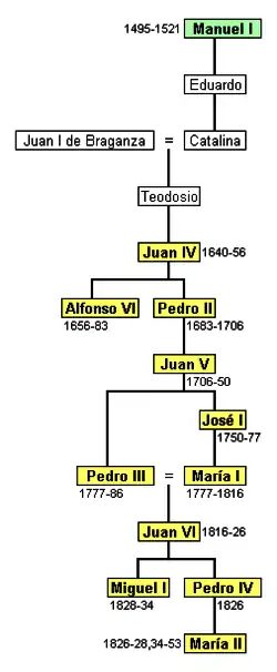 Cuando la invasión napoleónica llegó a Portugal, Juan VI de Portugal (hijo de Doña María I y Don Pedro III) se retiró a Brasil, de donde regresó en el año 1821. A su muerte en 1826 fue sucedido por su hijo Pedro IV de Portugal, quien optó por el Imperio del Brasil y abdicó al trono de Portugal a favor de su hija María II de Portugal, de entonces 7 años de edad. Sin embargo María II fue derrocada en 1828 por su tío Miguel I y no recuperaría el trono hasta 1834, cuando Miguel I fue obligado a abdicar. Sin embargo, en el exilio Miguel seguiría reclamando sus derechos, originándose la rama miguelista en oposición a la línea reinante, llamada constitucional.