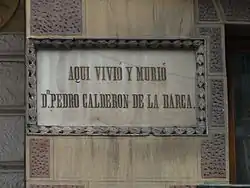 Mesonero Romanos pidió además al Ayuntamiento que se pusiera en la fachada, y como homenaje, un relieve con el busto de Calderón, añadiendo sus atributos como poeta, sacerdote y caballero de Santiago. Al cabo de algunos meses y como respuesta se colocó a la izquierda del balcón de lo que fue piso principal una placa de mármol con la inscripción «Aquí murió D. Pedro Calderón».[1]