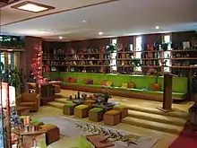 Trabajó un diseño estilizado de hojas en forma de galón en todo el diseño de la casa, incluidas las ventanas de los escritorios, las sillas de comedor y la alfombra de la sala.[3][4] Estos diseños, apodados The Winged Seed, están ubicados en las ventanas superiores perforadas y también se usaron en la casa de Bachman Wilson Usonian. La casa fue construida para entretener a los estudiantes universitarios de la familia. El salón fue diseñado para 50 personas.[7] Presentaba un largo sofá y espacio para sentarse en las escaleras.[7]