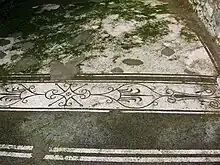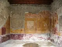 En la derecha había una cabeza de oro, que fue destruida durante la exploración.[2] El tablinum conserva intacto el suelo de mosaico con un diseño geométrico en el centro, mientras que en las paredes hay frescos del tercer estilo, que originalmente eran de color cinabrio, apoyados sobre un fondo ocre, del que hoy solo queda este último color.[8] A ambos lados, los paneles decorativos están divididos en tres compartimentos, similares a tapetes, decorados con elementos vegetales. En la pared derecha había pequeñas pinturas en el centro de cada compartimento que representaban a un sátiro abrazando a una ménade, a Ifigenia en Táuride y a una ménade con Cupido, todas ellas desprendidas y conservadas en el Museo Arqueológico de Nápoles,[11] mientras que en el lado izquierdo se conservan el fresco de un sátiro con una ménade, una representación incierta, que probablemente representa el regreso de Héctor como cadáver, y otro sátiro con ménade.[11]