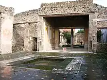 En el atrio se abre el tablinum, de dimensiones considerables, tal vez utilizado por el propietario para ejercer su profesión.[5] A ambos lados de las jambas de entrada hay dos pequeñas columnas sobre las que se colocaron dos hermas, en particular la de la izquierda soportaba una cabeza de bronce que representaba al tío o al padre [7] de Cecilio Jucundo,[8] regalo del liberto Félix, como atestigua la inscripción grabada en el pilar: «GENIO LUCI NOSTRI FELIX LIBERTUS».[9]