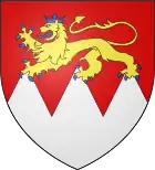En rojo, un león dorado de dos colas, corona azul y lengua azul, caminando sobre tres puntas plateadasIn Rot ein auf drei silbernen Spitzen schreitender zweischwänziger blau gekrönter und blau bezungter goldener Löwe