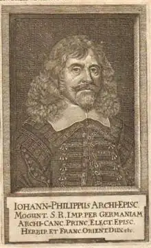 Johann Philipp se convirtió en sacerdote en la catedral de Wurzburgo a la edad de 16 años, fue trasladado a la catedral de Maguncia en 1625 y a la catedral de Worms en 1630. Se convirtió en preboste y, en 1642, fue elegido príncipe-obispo de Wurzburgo. Su despiadada persecución de la Contrarreforma eliminó el luteranismo del territorio que controlaba. Sus habilidades diplomáticas lo convirtieron en un importante mediador durante las negociaciones de los congresos de paz de Munster y Osnabrück que pusieron fin a la Guerra de los Treinta Años en 1648. Como resultado, en 1647 fue elegido además arzobispo de Maguncia y, por tanto, también gobernante del electorado de Maguncia y archicanciller.del Sacro Imperio Romano Germánico. En 1663 también recibió el obispado principesco de Worms. Fue un administrador eficaz de sus principados y pudo lograr la recuperación económica. Fortificó la ciudad de Maguncia y fundó hospitales y escuelas secundarias. Su corte fue un centro de la política alemana en la posguerra. Johann Philipp fue el primero de seis miembros de la familia Schönborn que, a lo largo de más de tres generaciones, gobernarían ocho de los principados eclesiásticos más prestigiosos del Sacro Imperio Romano.