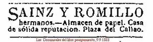 La “Casa de comercio Sainz Romillo” tiene su origen en 1845, con el comercio de papeles iniciado por José María Romillo Arena (Vallejo de Mena, Burgos, 1826-Madrid, 1865) fallecido sin descendientes directos [lower-alpha 1]