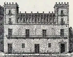 En base a los dibujo y grabados conservados se observan diferentes detalles del edificio. De planta rectangular con un patio central, dividido en dos en el siglo XVI,[2] se levantan tres alturas además de las mencionadas torres cuadrangulares en sus extremos, aterrazadas y adornadas con bolas. José María Zacarés describía así: