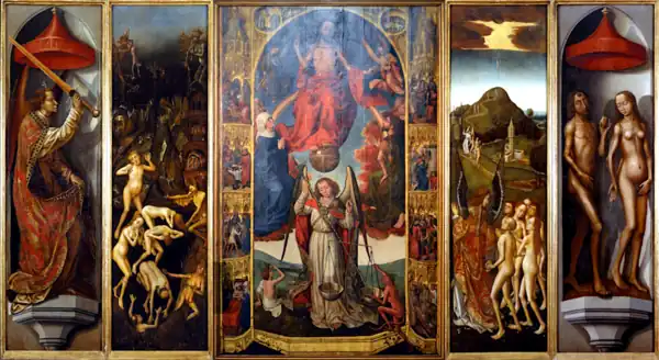 En el Museo Histórico Municipal de Valencia se custodia la tabla principal del tríptico del Juicio Final obra del pintor neerlandés Vrancke van der Stockt (c. 1420 - c. 1495). En la tabla central se representa una escena de Cristo en Majestad rodeado por San Juan Bautista y la Virgen María (la Déesis), mientras tanto en la parte inferior se muestra al arcángel san Miguel con la balanza pesando las almas de los enjuiciados con un diablo tratando tramposamente de inclinar la balanza a su favor. Por lo que respecta a las tablas laterales, conservadas en el Museo de Bellas Artes de Valencia, se representan el Paraíso con los bienaventurados caminando (derecha [izquierda del espectador]) y el Infierno con los sufrimientos de los condenados (a la izquierda [derecha del espectador]) en la cara interna, mientras que en la externa se representa a Adán y Eva siendo expulsados del Paraíso. Este tríptico, adquirido en 1494 por el Consejo de la Ciudad, se encuentra en la ciudad de Valencia, aunque divididas sus partes entre dos museos diferentes sin que, hasta el momento, se haya llegado a un acuerdo satisfactorio para todas las partes que permitar reconstruir la obra completamente.[18]