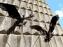 La fachada lateral se halla ornamentada con la escultura de dos cóndores en vuelo, obra de Ricardo Pérez Alcalá.