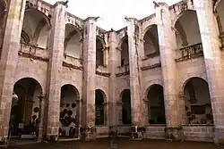 En su interior posee dos patios; el principal de planta cuadrangular presenta arquerías de medio punto presididas por contrafuertes, sus corredores circundantes se hallan techados con bóvedas de lunetos. Las distintas salas se distribuyen a su alrededor y presentan bóvedas de cañón o techos de viguería de madera. El patio secundario de planta cuadrangular es austero y se encuentra presido por muros de cantera donde se asoman algunas ventanas rectangulares. El cubo de la escalera principal de cuatro rampas se halla techado con una bóveda de pañuelo donde están trazados casetones.