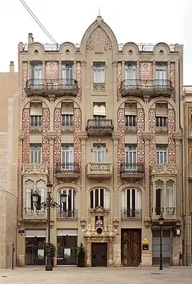 Consta de planta baja y cuatro alturas. La parte más destacada del edificio se corresponde con la fachada que da a la plaza de la Almoina. Destacan en su fachada principal su rica ornamentación vegetal con esgrafiado tipícamente modernista, su característico color rojo, los balcones, unos realizados en piedra con profusa ornamentación y otros elaborados en forja de hierro. Posee dos pequeños miradores en la primera altura, en el extremo izquierdo y derecho del edificio.