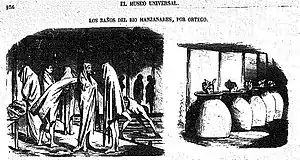 "Se hallan todos los días baños de todas clases, bien sea para disfrutarlo allí mismo, o para hacerlos conducir a las casas donde se pidan. Además de los baños comunes se suministran también de salvado, aromáticos, emolientes y minerales artificiales... Los cuartos de los baños minerales están en departamentos separados de los comunes y cada pila se halla dispuesta según el objeto a que se destina. Hay un salón de descanso con estufa, y los cuartos están esterados en el invierno. Los concurrentes hallarán allí, a los precios corrientes, chocolate, café, caldo, etc. Al salir del baño y para evitar el cambio repentino de temperatura, pueden pasar al gabinete librería, y entretenerse en la lectura todo el tiempo que gusten".[16] Diccionario geográfico-estadístico-histórico de España y sus posesiones de UltramarDiccionario Madoz (Volumen X, pág. 971)