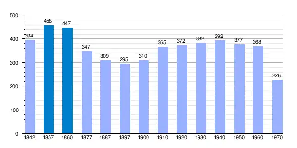 | Gráfica de evolución demográfica de Casasana[5] entre 1842 y 1970 |