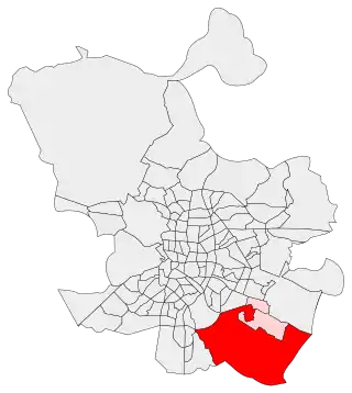 ![]() Ubicación del barrio (rojo) en el distrito (rosa) y en el término municipal de Madrid (gris) | ||