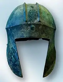 - Esta obra contiene una traducción derivada de «Illyrian type helmet» de Wikipedia en inglés, concretamente de esta versión, publicada por sus editores bajo la Licencia de documentación libre de GNU y la Licencia Creative Commons Atribución-CompartirIgual 4.0 Internacional.