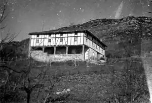 La fachada este presenta dos accesos a la cuadra y vanos de desigual distribución. El muro de la planta baja es de mampostería, levantándose sobre él un paramento de entramado actualmente oculto por el revoco, basado en postes verticales que llevan tornapuntas de lira en la parte superior.