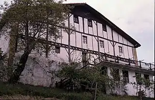 Se trata de un caserío de planta cuadrada de 20 x 20 m, dos plantas, bodega y desván situado en una ladera de gran pendiente. Cubierta a dos aguas de teja canal con gallur perpendicular a la fachada principal de orientación SE. La fachada principal se alza sobre 4 postes enterizos unidos por largas correas y refuerzos con tornapuntas. Posee también entramados intermedios en sentido vertical en su mayoría. A altura del forjado de la primera planta son visibles los extremos de la solivería. Todos los vanos están rellenos de mampostería raseada y pintada de color blanco. La composición es simétrica, poseyendo dos líneas de ventanas dispuestas a la altura de la primera planta y del desván. Sobre las ventanas del desván se sitúa el hastial cerrado con tablazón. La fachada se halla enmarcada entre dos esquinales de piedra sillar de arenisca.