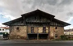 La edificación presenta una planta rectangular de mayor fondo que el frente, con dos alturas y otra entre cubierta. La cubierta se resuelve en dos aguas con cumbrera dispuesta a eje y en fondo, al tiempo que conforma un amplísimo alero apeado mediante largos tornapuntas, solamente explicable por el hecho de la supeditación del caserío al camino real lo que le obliga a tener la fachada principal orientada al noroeste y en consecuencia prever una adecuada protección frente a las inclemencias del viento y la lluvia. La organización estructural es simétrica en cuatro crujías dispuestas a lo ancho del frente, de suerte que las crujías laterales se construyen con mampostería en toda su altura con dobles esquineros de piedra labrada, en ellas se abre un hueco por planta, centrado y recercado en sillería confiriéndole un claro carácter murario por la relación vano hueco. Las dos crujías centrales, ligeramente retrasadas, constituyen un cuerpo central más liviano, no solo por el imponente porche que en ellas se abre en planta baja, sino también por su ejecución a base de entramado y relleno de ladrillo. Dicho porche, está constituido por una gran viga de madera primorosamente labrada y una columna central de estilo toscano con un ligero éntasis, a modo de parteluz. Sobre el porche, una balconada corrida acrecienta el carácter unitario del cuerpo central. La estructura interior es de madera en su totalidad y parece responder a la época de referencia de su fachada principal. En la actual fachada zaguera puede apreciarse la existencia de diversas refacciones, huecos de diversas facturas y un elemento interesante en la zona central como es el remetido del plano de fachada en la altura correspondiente a entre cubierta, y que estando hoy conformado como un pequeño balcón, en su día estuvo cerrado, con toda seguridad, en tabla de madera.
