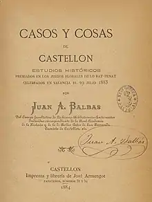- Balbás y Cruz, Juan Antonio (1884). Casos y cosas de Castellón. Castellón de la Plana: Imprenta y librería de José Armengot. Wikidata Q115650186.