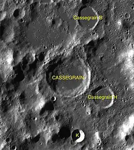 Cassegrain es un cráter de impacto que se encuentra en la cara oculta de la Luna, más allá de la extremidad del sudeste, al sureste del cráter de mayor tamaño Lebedev y al noreste de Priestley, de tamaño comparable.