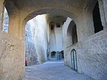 Para acceder dentro del castillo, hace falta recorrer una rampa empinada y atravesar un puentecillo flanqueado por paredes laterales en las que se abren doce aspilleras por cada lado. Después del puentecillo hay la Grotta dell'eremita (Gruta del ermitaño), una cueva que, según la tradición, habría hospedado en tiempos antiquísimos a un anacoreta.